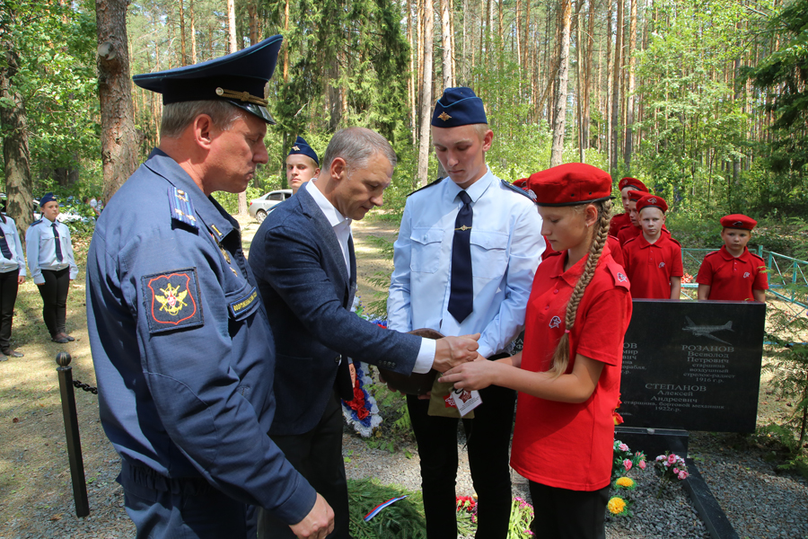 Председатель областной Думы Аркадий Фомин поблагодарил жителей села Салаур, учеников и педагогов Занино-Починковской школы за то, что все эти годы они ухаживают за могилой летчиков, и за большую поисковую работу.