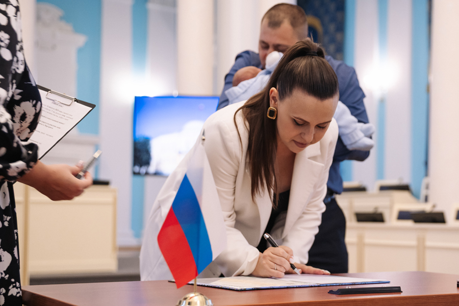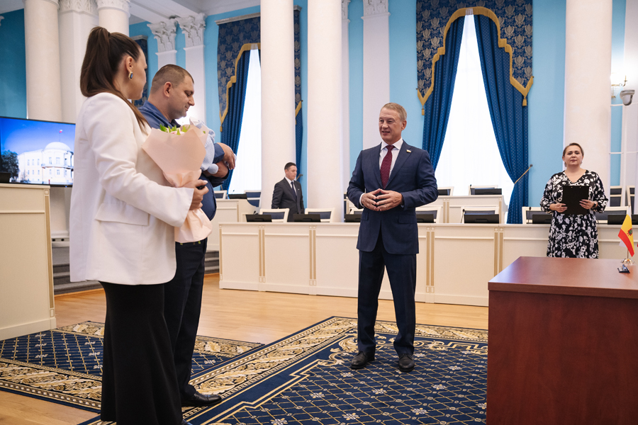 В пятницу, 29 августа, в Гербовом зале Рязанской областной Думы состоялась торжественная церемония регистрации новорожденного. С радостным событием родителей малыша – Маргариту и Дениса Кадушкиных – поздравил спикер регионального парламента Аркадий Фомин. В праздничном мероприятии также приняла участие начальник главного управления ЗАГС Рязанской области Елена Сорокина.